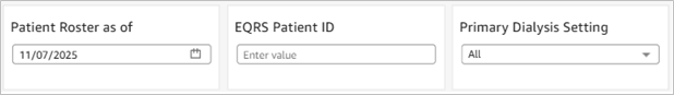 Filtering Options The Facility Patient Roster Dashboard can be filtered by an “as of” date, by EQRS Patient ID, and by Primary Dialysis Setting (Figure 12). Users of the CMS or Corporate or Network versions of this dashboard have additional filters. The CMS and Corporate dashboards have options to filter by Facility CCN, Network, and Facility State. Additionally, CMS and Network level users can filter by Electronic Data Interchange (EDI) Organization. |