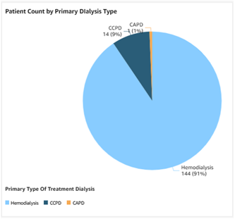 | The Patient Roster Dashboard also provides graphs displaying Patient Count by Primary Dialysis Type (Figure 14), Patient Count by Dialysis Setting (Figure 15), and the top 10 Primary Causes of Renal Failure (Figure 16). |