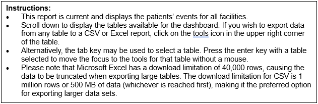 Dashboard Overview The top The top of the Patient Events Summary Dashboard presents details regarding the data source, refresh frequency, and instructions for using the dashboard (Figures 3 and 4). |