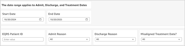 Filtering Options The facility level dashboard can be filtered by Start Date and End Date, EQRS Patient ID, Admit Reason, Discharge Reason, and Misaligned Treatment Date (Figure 5). Users of the CMS or Corporate or Network versions of this dashboard have additional filters. The CMS and Corporate dashboards have options to filter by Facility CCN and Network. Additionally, CMS and Network level users can filter by Electronic Data Interchange (EDI) Organization. |