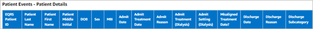 | The summary table in the dashboard, Patient Events – Patient Details, provides a list of the patients with variables that include but are not limited to admission date, admission reason, treatment, discharge reason, discharge subcategory, and date of death, which would be reported if the patient has died (Figure 6). Please note that the patients displayed in the dashboard will depend on which filters are selected. |