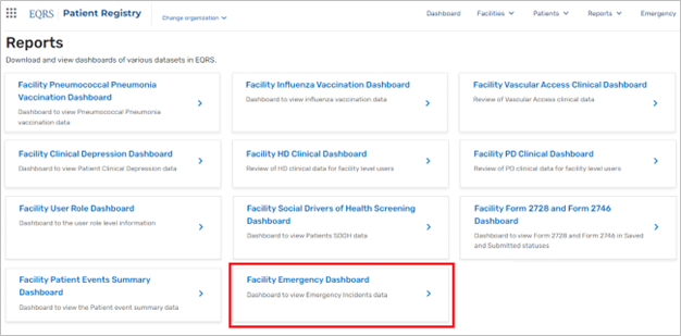 To access the Emergency Dashboard, log in to the Patient Registry in EQRS and select Reports Dashboard from Reports in the navigation bar (Figure 1).