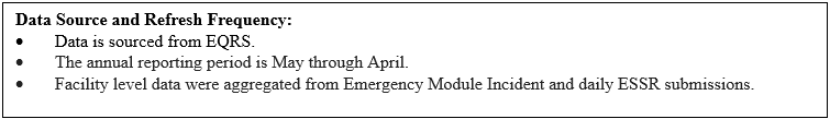 The top of the Emergency Dashboard presents details regarding the data source and refresh frequency (Figure 3). Data in the dashboard is in real time and accurately reflects what has been submitted.
